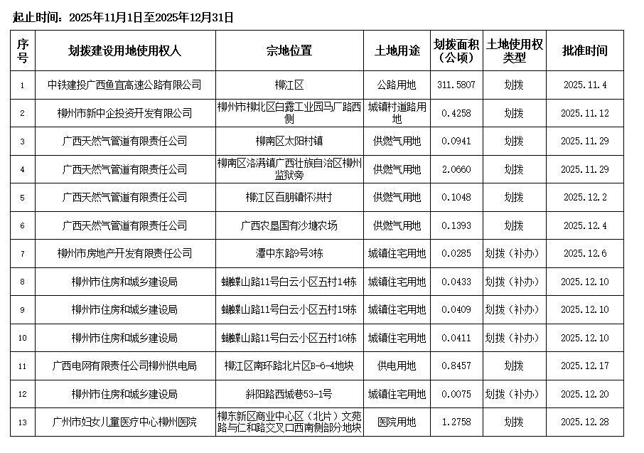 2025年柳州市市本级国有建设用地使用权划拨批准结果公示