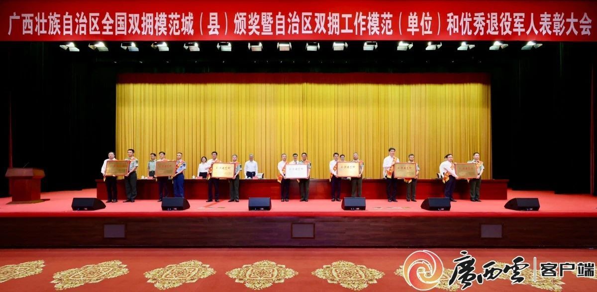 在全场热烈掌声中,陈刚、韦韬等为广西获命名的全国双拥模范城(县),自治区双拥工作模范单位、模范个人,自治区优秀退役军人代表颁奖。