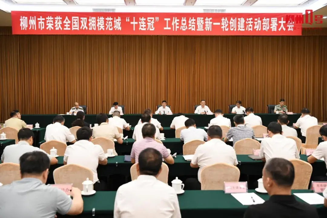9月24日,柳州市荣获全国双拥模范城“十连冠”工作总结暨新一轮创建活动部署大会召开,深入学习贯彻习近平总书记关于双拥工作的重要论述和关于广西工作论述的重要要求,认真贯彻落实党中央、国务院和自治区党委、政府部署要求,全面总结双拥工作,研究部署下一步任务,不断巩固发展军政军民团结良好局面,为奋力推进中国式现代化柳州实践汇聚强大力量。自治区党委常委、统战部部长,自治区副主席,柳州市委书记谭丕创出席并讲话。市长张壮主持,市政协主席陈鸿宁出席。市委副书记索申敬传达习近平总书记关于双拥工作重要指示精神、全国双拥模范城(县)命名大会精神并宣读关于命名全国双拥模范城(县)的决定。