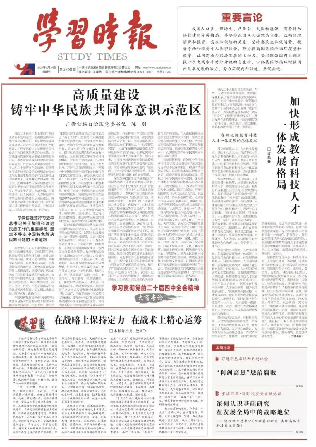 1月30日出版的《学习时报》头版头条刊发广西壮族自治区党委书记陈刚署名文章:《高质量建设铸牢中华民族共同体意识示范区》。全文如下。