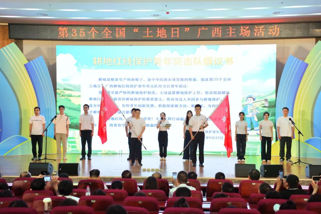 活动直播连线柳州市自然资源和规划局,将现场气氛推向高潮。柳州市带来侗语山歌演唱,悠扬歌声传递千年农耕智慧与新时代耕地守护决心;AI大使“柳小耕”亮相,以科技视角解码耕地保护“智慧密码”。广西自然资源职业技术学院耕地红线保护青年突击队队员作了题为《畯守壮乡,青春护耕》的演讲,展现青年一代守护土地的担当。随后,自治区自然资源厅领导为青年突击队授旗,自治区田长制办公室与青年突击队共同发出“青年担当,保护有我”的集体倡议。
