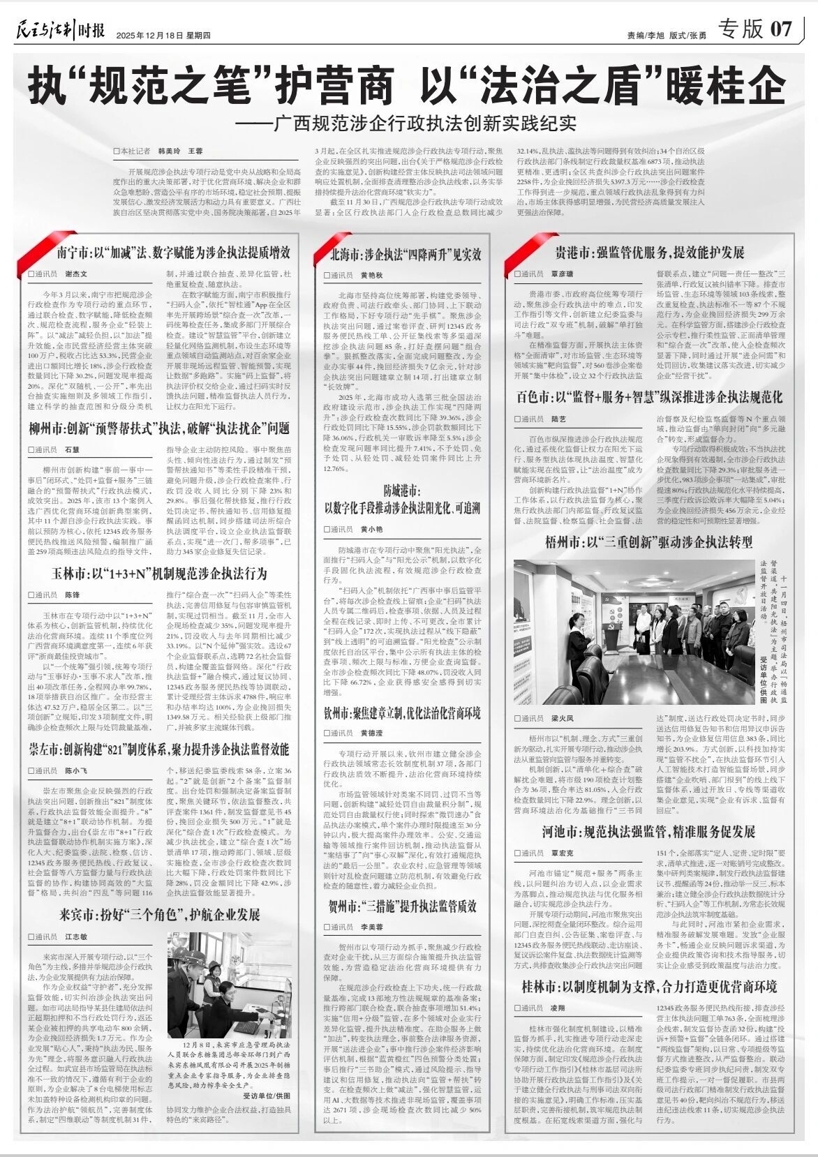 截至11月30日,广西规范涉企行政执法专项行动成效显著:全区行政执法部门入企行政检查总数同比减少32.14%,乱执法、滥执法等问题得到有效纠治;34个自治区级行政执法部门条线制定行政裁量权基准6873项,推动执法更精准、更透明;全区共查纠涉企行政执法突出问题案件2258件,为企业挽回经济损失5397.3万元……涉企行政检查工作得到进一步规范,重点领域行政执法乱象得到有力纠治,市场主体获得感明显增强,为民营经济高质量发展注入更强法治保障。