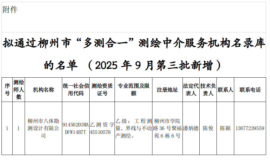 根据《柳州市“多测合一”服务机构管理办法(试行)》(柳资源规划发〔2020〕106号)要求,我局对2025年9月申请列入柳州市“多测合一”测绘中介服务机构名录的申报材料进行了审核,拟通过以下单位的申请,现予以公示。公示时间为2025年9月19日至2025年9月26日。