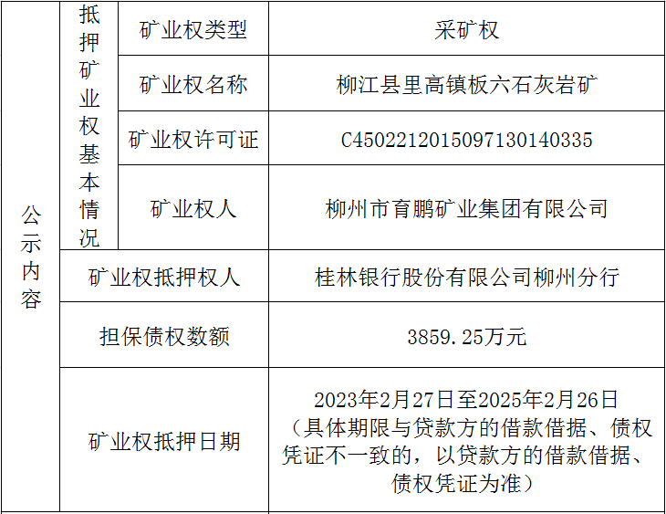 柳江县里高镇板六石灰岩矿矿业权抵押解除信息公示