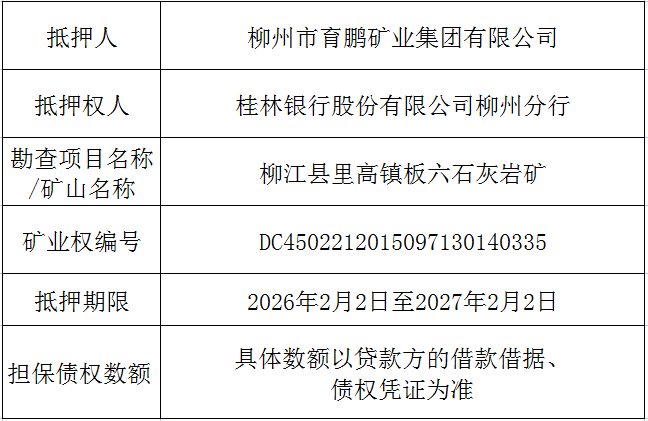 柳江县里高镇板六石灰岩矿矿业权抵押权首次登记结果公告