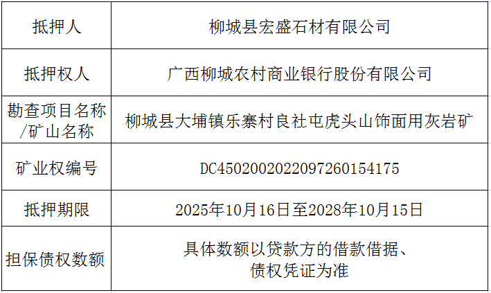 柳城县大埔镇乐寨村良社屯虎头山饰面用灰岩矿矿业权抵押权首次登记结果公告
