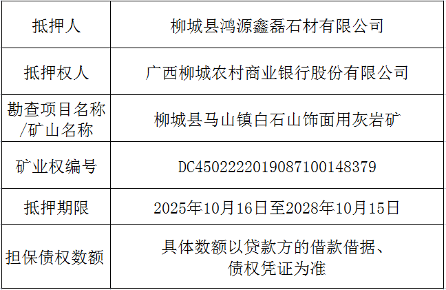 柳城县马山镇白石山饰面用灰岩矿矿业权抵押权首次登记结果公告