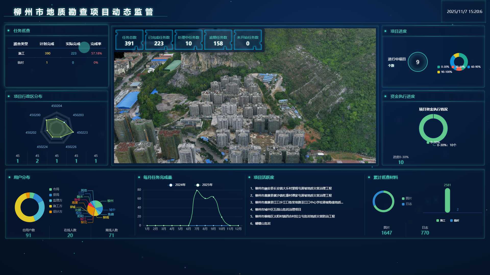 柳州市地质灾害防治项目监管平台作为柳州市实施“地质项目监管+数字赋能”的核心举措,通过优化项目管理流程,打破时空壁垒,促进多方协作。平台上线以来,已有柳州市城中区五指山危岩地质灾害治理工程等5个治理项目纳入平台管理,累计发布施工任务378条,完成施工任务215条,生成任务数据2500条,有效提升地质灾害监管防治水平。未来,平台将持续接入卫星遥感、物联网监测数据,打造空天地一体化的地质灾害防治智能体系。