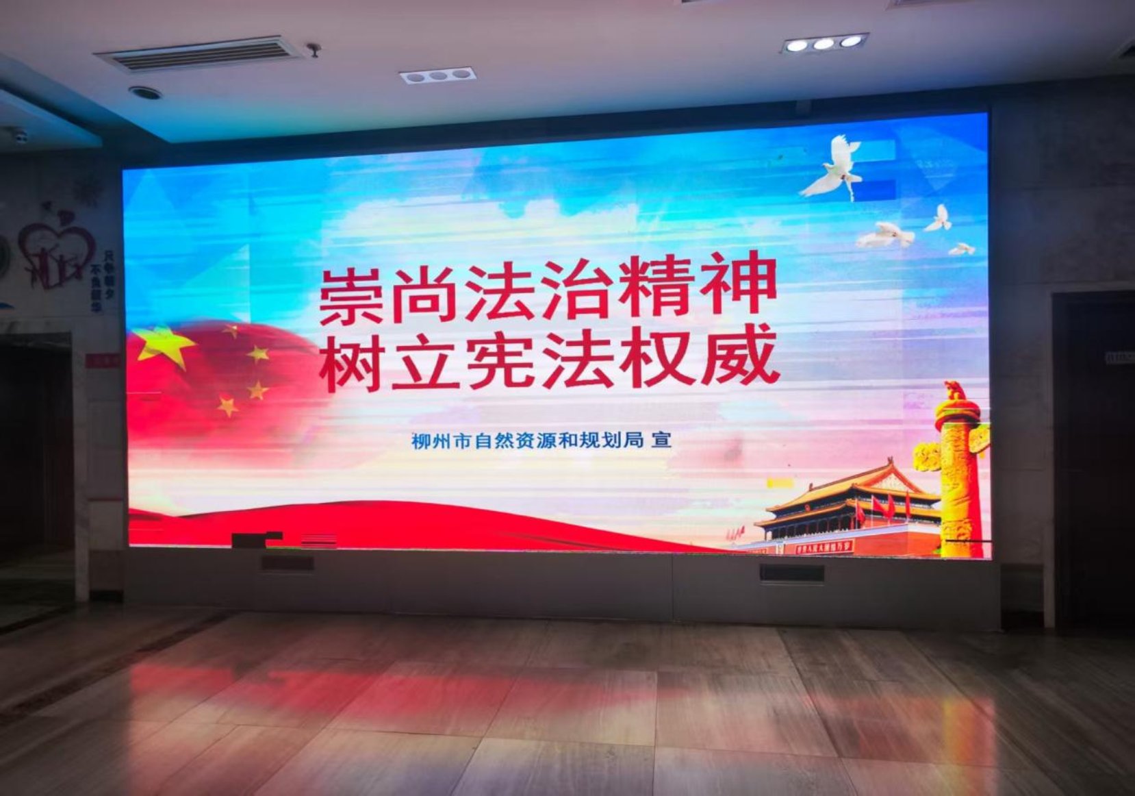 图为“宪法宣传周”期间,柳州市自然资源和规划局办公楼大屏幕播放宪法宣传海报和视频