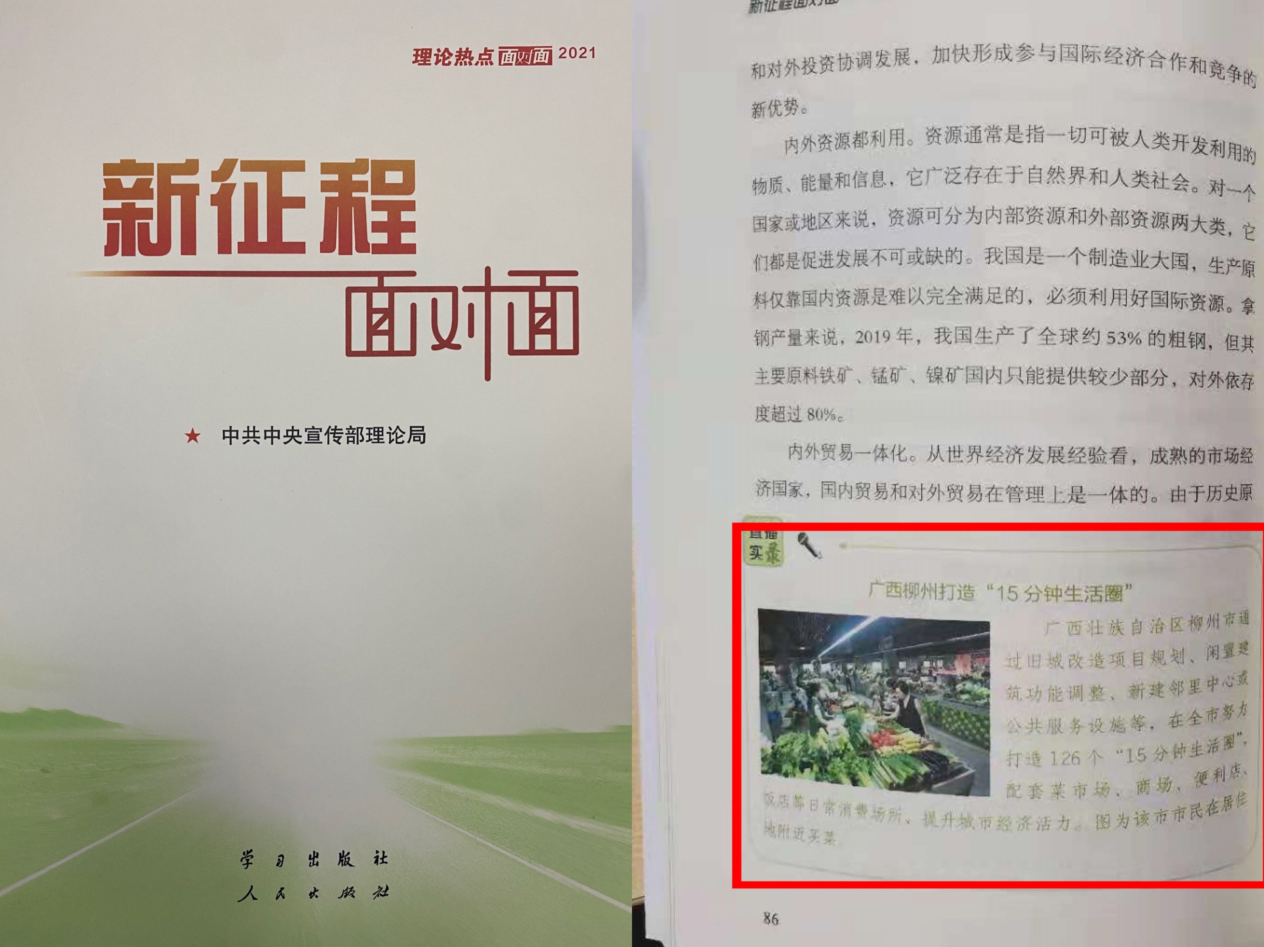 近日,柳州市打造“15分钟步行社区生活圈”工作经验被中共中央宣传部理论局采用,入选《新征程 面对面》(2021)一书,并由学习出版社、人民出版社联合出版发行。